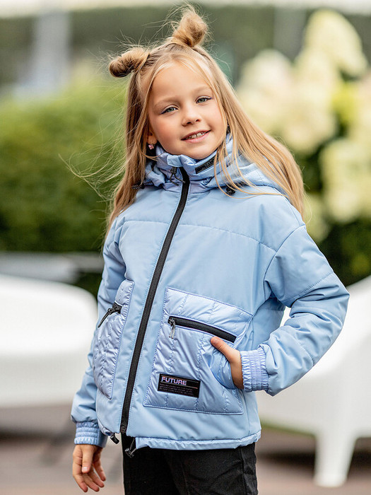Куртка для девочки Вера демисезонная голубая с утеплителем. Материал с ветро- и водоотталкивающим покрытием. Украшена нашивками с надписями. Съемный капюшон регулируется с помощью шнурка-кулиски со стопперами. Центральная застежка на молнию с защитой подбородка.   Особенности:  Съемный регулируемый капюшонСпущенная линия проймыКарманы с вертикальной и горизонтальной молниейСовмещение матовой ткани и ткани с металлизированным эффектомРегулировка по низуСветоотражающие элементыЭластичные манжеты рукавов Характеристики:Ткань верха: Twill stretch (мембрана) Подклад: T/CУтеплитель: 150 гр Температурный режим от +10 до -5 СПроизводитель: batik