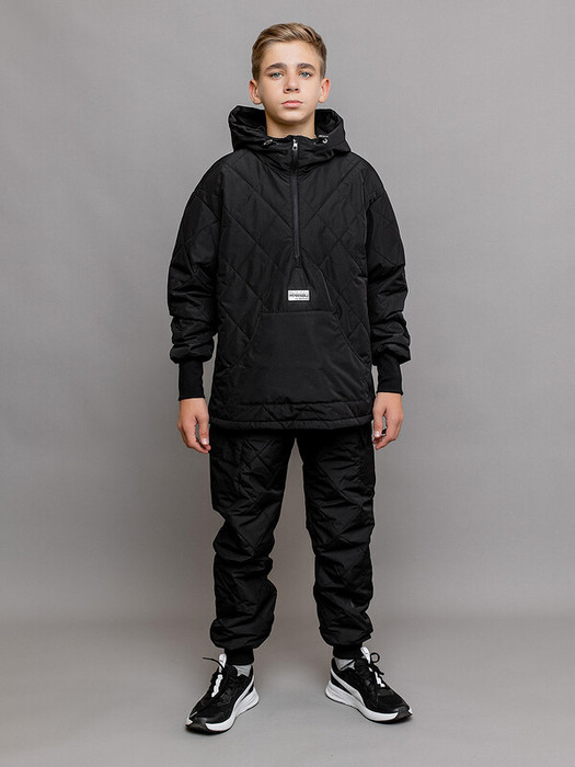 Модный стеганый комплект для детей Энжи – настоящий тренд 2024 года: анорак и брюки. Анорак имеет свободный крой со спущенной линией плеча. Анорак и брюки можно носить отдельно. Комплект стеганый из тонкой плотной мембранной ткани с подкладкой из гладкой мягкой таффеты. Анорак с застежкой по центру в верхней части, капюшон с регулировкой по лицевому краю, вместительный карман-кенгуру, низ рукава с мягкой трикотажной манжетой. Низ фигурный с удлиненной спинкой и боковыми разрезами. Брюки-джоггеры на эластичном поясе с кулисой для регулировки ширины, удобными карманами и боковыми накладными карманами с клапаном. Низ штанин с трикотажным манжетом.