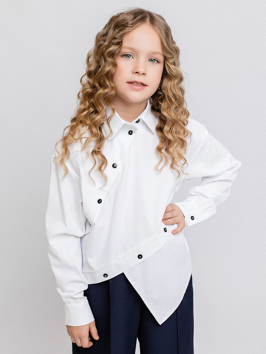 Блузка для девочки белая оверсайз с длинными рукавами. Ассиметричная застежка на пуговки. Элегантная блузка для школы выполнена из сорочечной ткани, смотрится стильно и оригинально.Характеристики:Ткань: Сорочечная ткань 60%хлопок, 40%полиэстерПроизводитель: Batik