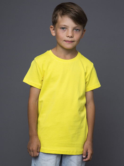 Яркая детская футболка желтого цвета с коротким рукавом.