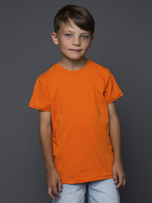Яркая детская футболка оранжевого цвета с коротким рукавом.