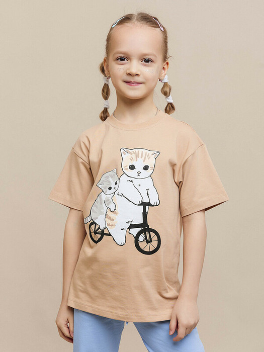 Футболка для девочки бежевая  с коротким рукавом из супрема. Из мягкого, гипоалергенного полотна с принтом в виде милых котиков. Качественный пошив, выдержит множество стирок, при соблюдении рекомендаций по уходу. Футболка изготовлена из гипоаллергенного материала супрем пенье, который не вызывает раздражение и позволяет коже дышать.Характеристики:Ткань: Супрем пенье 92% хлопок 8% эластанПроизводитель: batik
