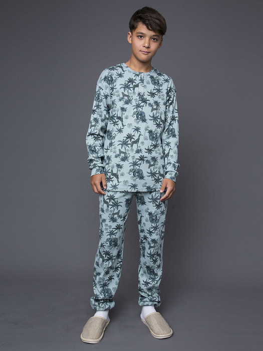 Стильный пижамный комплект для мальчика: футболка с длинным рукавом и брюки в голубом цвете с принтом. Изготовлен из качественного хлопка с добавлением эластана для идеальной посадки и комфорта. Универсальный вариант для повседневной носки.Характеристики:Ткань: Кашкорсе 95% хлопок 5% эластанПроизводитель: batik