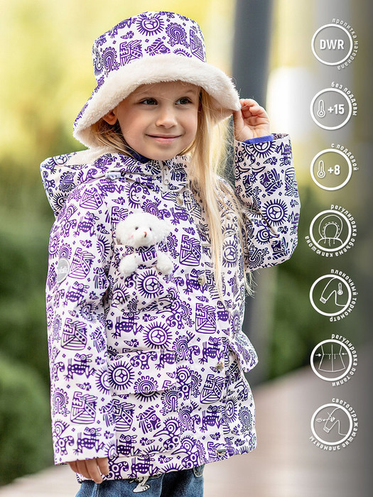 Куртка-парка для девочки Дора демисезонная из мембраны без утеплителя. Красивая бежевая куртка-парка с оригинальным принтом и подкладом велмех. Резинку на талии можно затянуть для идеальной посадки. Капюшон регулируется по объему. В боковые карманы можно положить игрушки или носовой платочек.