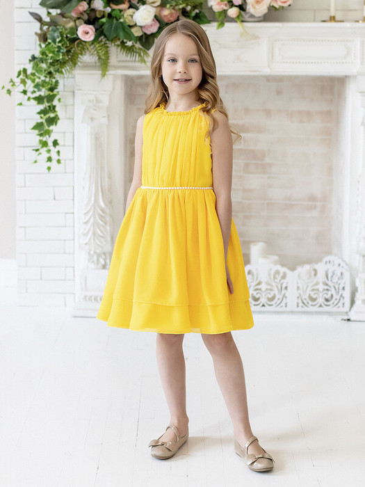 Нарядное желтое платье в романтичном стиле без рукавов. Поясок из бусин. Подкладка 100% хлопок. Характеристики:Размеры (рост): 98-134Ткань верха: Сатин - Полиэстер Сетка - ПолиэстерПодкладка 100% хлопокПроизводитель: batik