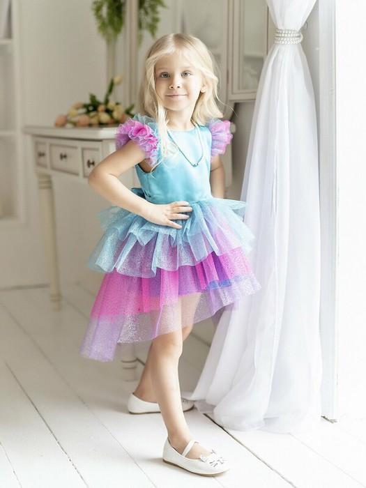 Нарядное платье разноцветное с пышной юбкой, со шлейфом. Короткие рукава-фонарики, подклад хлопок.Особенности модели: На спинке имеется поясок чтобы дополнительно утянуть талию Розово-голубой цветЮбка многослойнаяХарактеристики:Размеры (рост): 98-134Ткань верха: Сатин - Полиэстер Сетка - ПолиэстерПодкладка 100% хлопокПроизводитель: batik