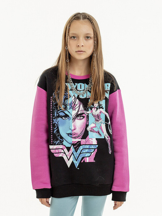 Свитшот подростковый из футера для девочек. Черно-розовый свитшот с ярким принтом Чудо-женщина из комиксов.
