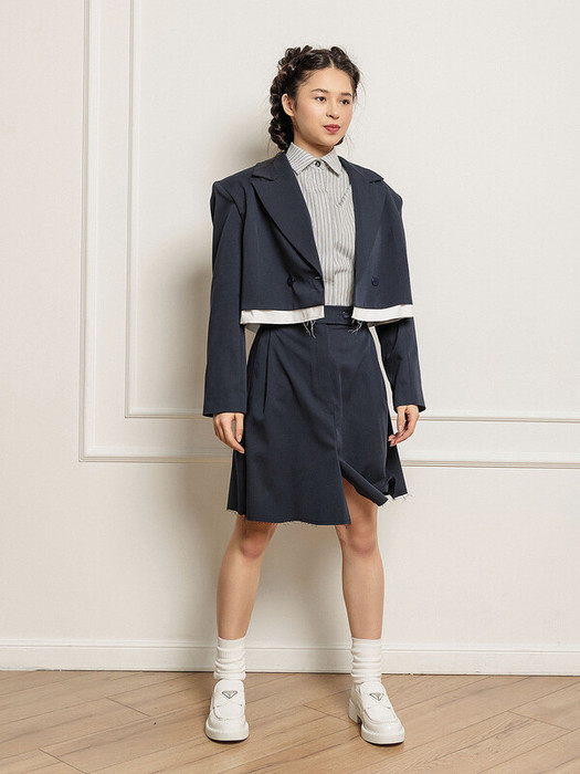 Жакет укороченный темно-синий на подкладке для девочки. Застежка двубортная, рукав двушовный эргономичный. Костюмный воротник, по низу декоративный элемент из сорочечной ткани с необработанным краем.Характеристики:Ткань: Хлопок 60%, Полиэстер 40%Производитель: batik