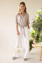 Блузка прямого силуэта, длиной ниже бедер, выполнена из однотонной ткани. Полочка с застежкой на петли и пуговицы, по правой нижней части декор в виде принта. Спинка с отрезной кокеткой, но которой выполнен декор в виде принта. Воротник рубашечного типа, стояче-отложной. Низ блузки ассиметричный, по побоковым швам обработана застежка. Пройма углубленной формы, рукав рубашечного типа, длиной 7/8 по низу с патами.