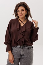 Блузка свободного силуэта с ассиметричной линией низа, на подкладке. Воротник отложной по переду, переходящий в завязки на бант или галстук добавляет шарма данной модели. По спинке застежка молния. Рукав широкий втачной, длиной 3/4.