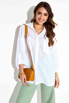 Блузка прямого силуэта. Горловина обработана отложным воротником-стойкой, по переду расположены симметричные складки и декоративная капелька, по спинке с застежкой на навесную петлю и пуговицу. Спинка со средним швом. Рукав втачной прямой длинный, по низу со сборкой и манжетой с застежкой на петлю и пуговицу.
