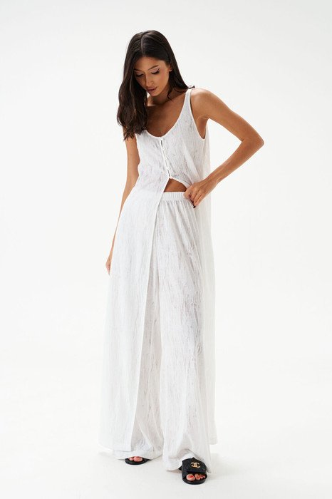 Блузон длины макси выполнен из трикотажного полотна полупрозрачного светлого цвета. Силуэт свободный. Без подкладки. Застёгивается от груди на ряд пуговиц. Длина по спинке 139см.