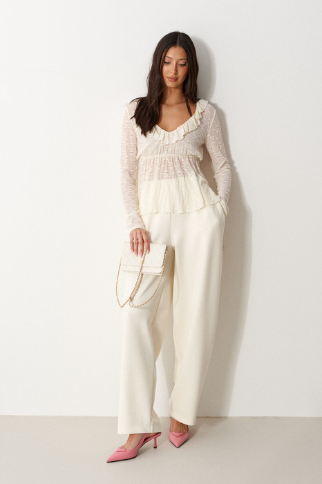 Джемпер полуприлегающего силуэта. Выполнена из трикотажного полотна. Характеристики: приталенный силуэт, без рукавов, вырез горловины круглый, глубокий по переду , по всей окружности притачана рюша, по талии джемпер разделен и присборен на резинке, низ обработан открытым срезом. Длина спинки 58 см