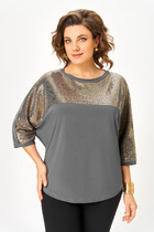 Блузка выполнена из тонкого трикотажного полотна в комбинации с отделочной тканью в пайетки.