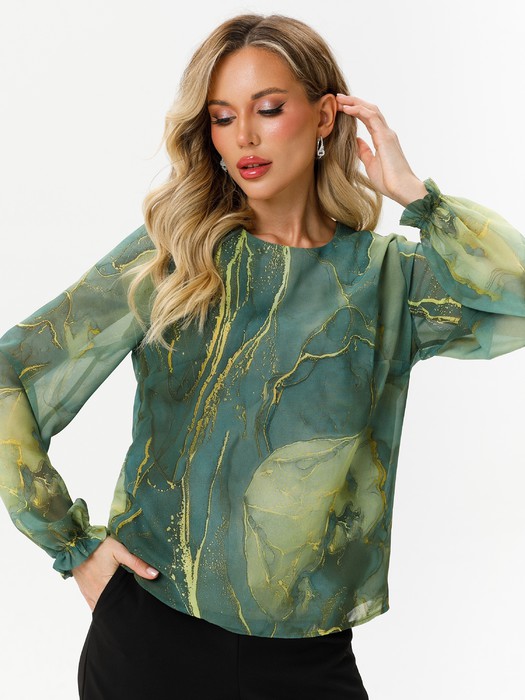 Очаровательная свободная шифоновая блузка, подчеркивающее женственность - отличное решение на каждый день или на праздник для современной стильной женщины. Шикарная модель с объемными длинными рукавами выполнена из высококачественного шифона. Круглая горловина с застежкой на пуговицу на спине. Нежная блузка  из шифона на трикотажном подкладе, по переду сделаны вытачки на грудь, рукава втачные пышные, длинные, снизу собраны на резинку.