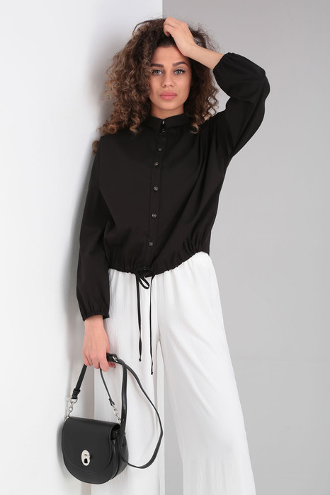 Блузка свободного силуэта, воротник рубашечного типа на стойке, рукав втачной на спущенной пройме со сборкой на эластичной ленте. Застежка петли, пуговицы. По низу полочки регулируемая кулиска.