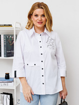 Блуза прямого силуэта. По центру полочки застежка в виде планки на миниатюрные пуговицы. Полочки с накладными карманами. Воротник отложной, рукав втачной, внизу обработан притачной манжетой с застежкой на пуговицы. Спинка с отрезной кокеткой, низ скруглен, в боковых швах небольшие разрезы.