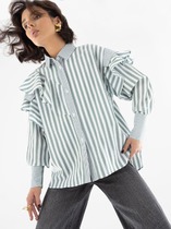Воротник выполнен из двух слоёв ткани, имеет округлую форму с удлинёнными концами, создающими визуальную вертикаль и вытягивающими силуэт. Центральный волан мягко спадает вниз, формируя выразительный, но не перегруженный акцент.