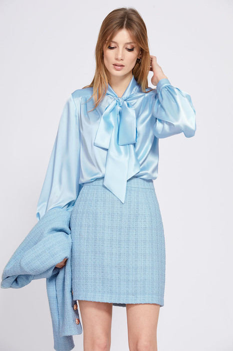Блузка выполнена из атласа. По переду на кокетке. Рукав втачной расширенный книзу, присборен на манжет, с застежкой на две пуговицы. В боковых швах разрезы. Воротник на стойке, переходящий в завязывающийся бант спереди.