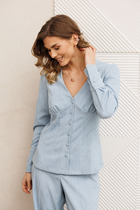 Блузка с застежкой на петли и пуговицы, втачным воротником с отрезной стойкой. По правой полочке- накладной карман. Спинка с отрезной кокеткой. Низ блузки фигурный. Рукав втачной, длинный, с отрезной манжетой.