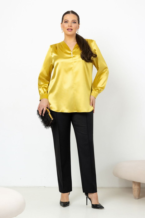 Элегантная дизайнерская блузка со складками выполнена из нежного щелк атласа с матовым блеском и декором из жемчуга отлично впишется  в ваш гардероб, легко сочетать как с брюками так и с юбкой. Блузка  прямого силуэта со средним швом и  V-образным вырезом с мягкими складками по горловине от плечевого шва, средний шов украшен пришитыми жемчужинами.  Спинка цельная, линия низа фигурная. Рукав втачной с притачной манжетой, застегивается на жемчужные пуговицы.