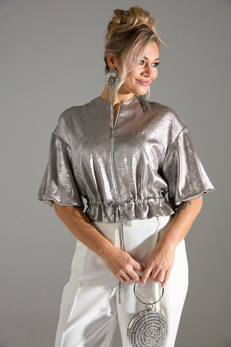 Блуза с застёжкой на молнию и объёмными рукавами. Линия талии на кулисе и завязке из основной ткани.