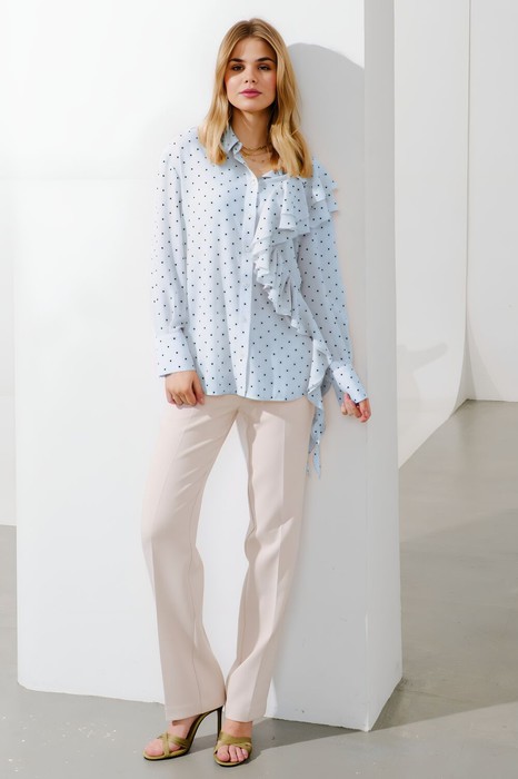 Блуза свободного кроя. Рукав длинный, линия плеча спущена. По низу рукава притачная манжета на застёжку петли и пуговицы. Воротник рубашечного кроя на стойке, застёжка центральная на петли и пуговицы. По переду левой половины блузы и на спинке фигурные рельефы, в которые вшиты по два волана.