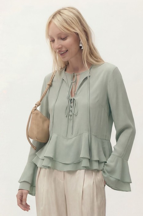 Блуза свободного кроя из шифона. Рукав втачной длинный, по низу рукава волан. Перед блузы состоит из двух слоев. Нижний слой с округлым вырезом горловины с застежкой на завязку и на навесные пуговицы и петли. Верхний, основной слой с округлым вырезом горловины на завязку и в области груди завязки. По низу воланы пришиты по переду и спинке в волнообразный подрез.
