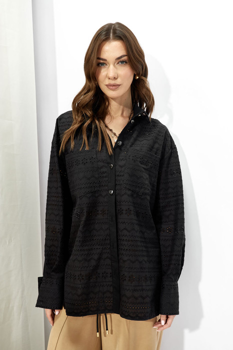 Блузка прямого силуэта из ришелье. Воротник рубашечного типа с центральной застежкой на петли и пуговицы. Рукав втачной длинный, по низу манжета на петли и пуговицы. По переду нагрудные карманы. На спинке кокетка и складки. По низу блузки в боковых швах разрезы. Обращаем ваше внимание, что фурнитура может отличаться от фото.