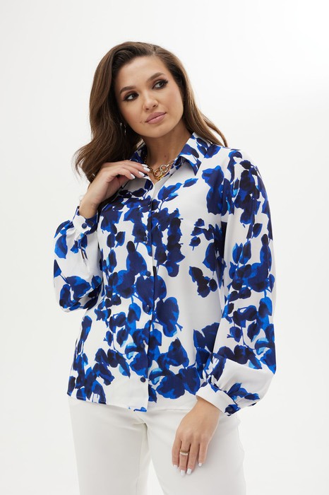 Блузка женская прямого силуэта на центральной застежке на петли и пуговицы. Перед с нагрудными вытачками от боковых швов. Спинка цельнокроеная. Рукав втачной одношовный длинный по низу со сборкой и на манжете, застегивающемся на петлю и пуговицу. Горловина на стойке с воротником