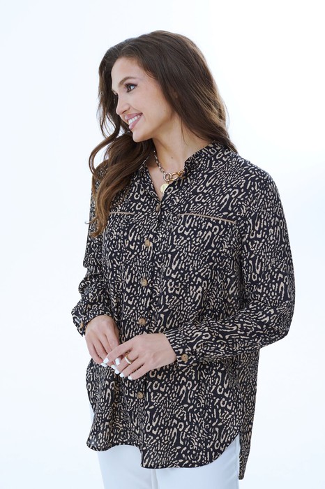 Блуза из легкой ткани (не просвечивается). Длинный рубашечный рукав со складкой, на манжете и застежкой на одну пуговицу. По спинке кокетка с двумя выходящими складками. По переду накладные карманы с отделкой по верхнему краю. Воротник рубашечный с отрезной стойкой. Низ разноуровневый закругленный.