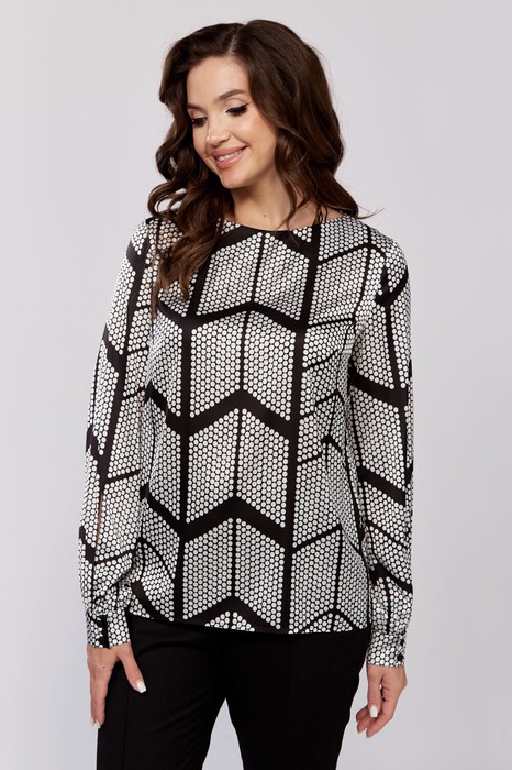 Блузка женская прямого силуэта. Перед с нагрудными вытачками от боковых швов. Спинка разрезная, вверху на спинке застежка на воздушную петлю и пуговицу. Рукав втачной одношовный длинный по низу со сборкой и на манжете, застегивающемся на петлю и пуговицу. Вырез горловины - лодочка.