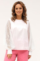 Женская нарядная блуза оригинального кроя прекрасно вольется в Ваш гардероб, благодаря своей уникальности. Изделие выполнено из тонкой блузочной ткани атлас-шифона с отделкой рукава и спинки из сетки с блеском. По переду застежка на петли с пуговицами, воротник рубашечный со стойкой. Блуза оверсайз, плечо спущено с втачным длинным рукавом на манжете. Спинка с подрезной плечевой кокеткой и складкой по низу, из-под кокетки имеется небольшая сборка. Низ блузы с фигурными вырезами по бокам.