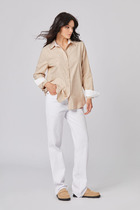 Блуза свободного силуэта. По переду планка с потайной застёжкой на семь прорезных петель и пуговиц. По спинке кокетка со сборкой. Рукава одно шовные втачные, на широкой манжете с двумя складками. Воротник отложной на стойке. Боковые швы блузы заканчиваются небольшими разрезами