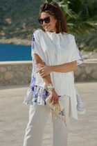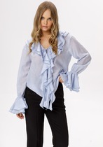Блуза женская, рукав втачной со сборкой по окату. Рукав расширяется к низу. V-образный вырез с двойным воланом. Низ рукава обработан манжетой на венгерке. В комплекте топ хлопка(100%) на регулируемых бретелях.