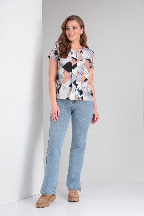 Стильная женская блуза прямого силуэта. Перед стачной, по центру с двумя отлетными планками, с V-образным вырезом по горловине. Горловина окантована. Спереди по горловине протянута в окантовку отделочная деталь.  Спинка с разрезом сверху горловины с окантовкой разреза и застёжкой на пуговицу. Рукав короткий, фигурный. Низ блузки на резинке.