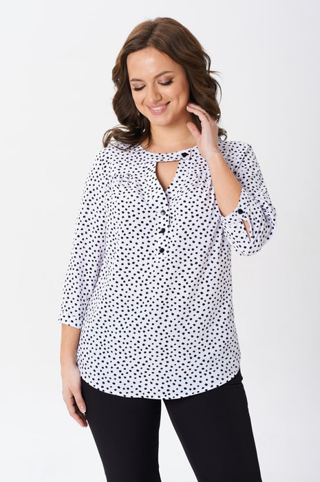 Женская нарядная блузка свободного кроя. По переду фигурная планка с V-образным вырезом застегивающаяся на пуговицу и кокеткой со сборкой. Спинка блузки цельная. Рукав с манжетой на застежку петля-пуговица. Низ изделия фигурный.