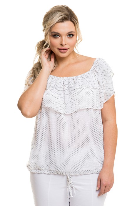 Повседневная блузка свободного силуэта, выполнена из шифона, с притачной кулиской по низу. Перед блузки целый, спинка со средним швом. Блуза без рукавов с двумя воланами по горловине. Горловина со сборкой на резину, что позволяет носить блузку с открытыми плечами. Блуза на подкладе без застежек. Длина изделия по спинке в 48 р-ре – 54 см. в 60 р-ре – 57 см.