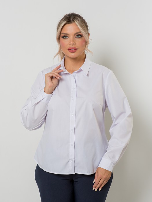 Удобная повседневная блузка, полуприлегающего силуэта, выполнена из сорочечной ткани. Блузка с отложным воротником с отрезной стойкой и центральной застежкой на петли и пуговицы по переду. Спинка целая с двумя вертикальными вытачками. Рукав втачной длинный с притачным манжетом с застежкой на петлю и пуговицу. Длина рукава от плеча в 48 р-ре – 58 см. в 64 р-ре – 64 см., ширина рукава по низу в 48 р-ре – 20 см. в 64 р-ре – 26 см. Низ блузки фигурный. Блузка без подклада. Длина изделия по спинке в 48 р-ре – 61 см. в 64 р-ре – 69 см.