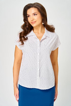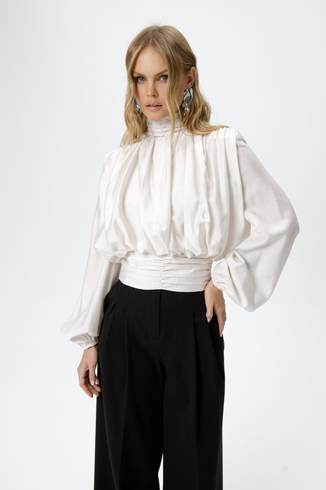 Детали: блуза приталенного силуэта, перед и спинка свободного покроя, пояс блузы со сборкой, расширенные плечи, сборки по плечам и горловине, застёжка на потайную молнию в боковом шве, воротник стойка со сборкой и застёжкой на навесные петли и пуговицы, втачные расширенные к низу рукава с резинкой по низу.