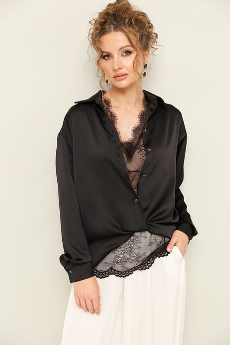 Элегантная блузка прямого кроя, выполнена из струящейся ткани с благородным матовым блеском. Горловина с рубашечным воротником на отрезной стойке, центральная застежка на петли и пуговицы. Перед блузки выполнен с декоративным перекрутом в низжней части застежки. Рукава со спущенной линией втачивания плеча, манжеты с застежкой на петли и пуговицы. Спинка с отрезной кокеткой и бантовой складкой.