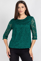 Блуза женская из текстильной ткани. Прямого силуэта. По спинке расположен подрез. В шов вставлено кружево. Рукав спущенный с манжетой. По плечевому шву  вставлено кружево. Вырез лодочка. Обработан притачной бейкой.