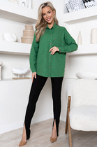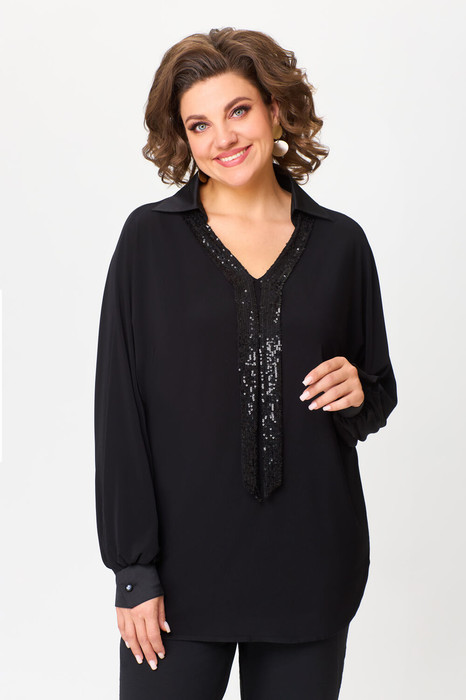 Блузка женская полуприлегающего  силуэта, с  цельнокроеным рукавом «летучая мышь» без застежки. Фактура материала эластичная и мягкая.  Горловина v-образная  с отложным   воротником на стойке. По горловине декоративная отделка из пайеток в виде «галстука». Спинка со средним швом.  Рукав  длинный,  по низу присборен на притачную манжету с застежкой на петли и пуговицы.  Блузка с фигурной линией низа.  Воротник и манжеты выполнены из отделочной ткани.