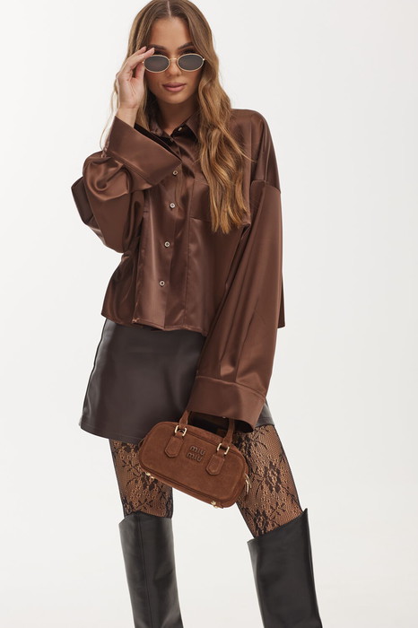 Блузка укороченная свободной формы из атласной ткани. Застежка по переду на петли и пуговицы. Воротник рубашечный. Рукав свободный с притачной манжетой по низу.