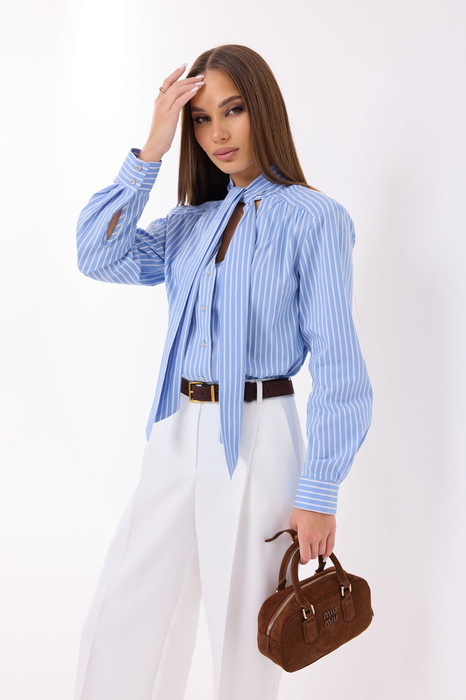 Блузка женская прямого силуэта. Рукав длинный с манжетой. Застежка на петли и пуговицы. По переду и спинке кокетки. Воротник стойка переходящая в завязку, образуя бант или узел. Длина вдоль середины спинки от шва втачивания воротника - 61,5 см. Длина рукава 61 см.