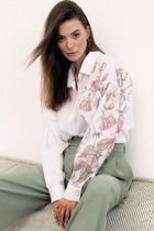 Блузка прямого силуэта. Застёжка по переду на петли и пуговицы. Воротник отложной фигурной формы. На переде накладной карман с вышивкой. Рукав прямой с манжетой. Манжета с застёжкой на петли и пуговицы. Низ блузки фигурной формы.