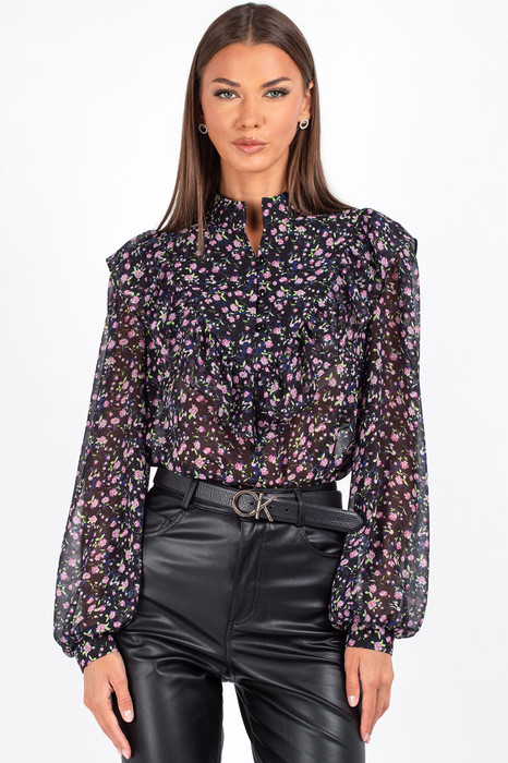 Блузка с длинным рукавом выполнена из ткани с цветочным принтом — мелкие розовые, сиреневые и зелёные цветы на чёрном фоне создают эффект глубины и утончённости. Идеально сочетается с кожаными брюками, юбками и классическими джинсами.