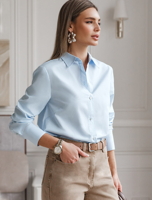 Состав: 100%Хлопок Параметры модели на первом фото: Рост 170, бюст 89, талия 63, бедра 92 Размер товара на первом фото: 42Блузка выполнена из премиального хлопкового поплина. Лаконичная модель с высокими манжетами и пуговицами из натурального перламутра хорошо впишется в любой гардероб и внесет яркий летний акцент в образ. Натуральный состав ткани обладает высокой воздухопроницаемостью и гигроскопичностью. В изделии будет комфортно, даже в самое жаркое время года. Подходит для любой фигуры. На спинке фирменный логотип бренда.