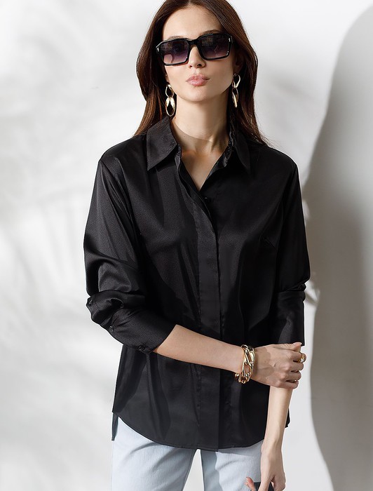Состав: 94%ПЭ 6%ПУ Плотность: 107 Г/м2 Параметры модели на первом фото: Рост 170, бюст 89, талия 63, бедра 92 Размер товара на первом фото: 42Сатиновая блузка с эластаном в черном цвете – воплощение элегантности и комфорта. Благородный блеск сатина добавляет образу шика, а эластичность материала гарантирует удобство при носке. Прямой силуэт блузки обеспечивает комфорт, а эластичность материала предотвращает деформацию. Застежка-планка с потайными пуговицами придает модели аккуратность. Универсальный вариант для casual-образов.