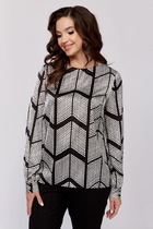 Блузка-рубашка женская из штапельного полотна с набивным рисунком «полоска», свободного кроя, удлиненная, со стояче-отложным воротником, спущенным длинным рукавом. Перед из двух частей с центральной бортовой застежкой на петли и пуговицы, спинка цельнокроеная. Низ рукава с притачной манжетой, застегивающейся на петлю и пуговицу.